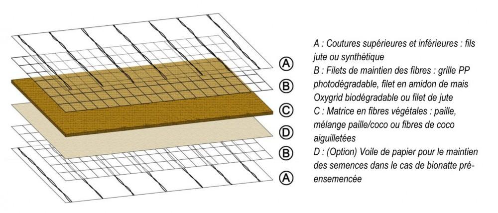 Il existe de nombreux type de bionattes qui peuvent en outre être combinées avec des géofilets ou des grilles métalliques, de masses surfaciques variées, de structures différentes, etc.