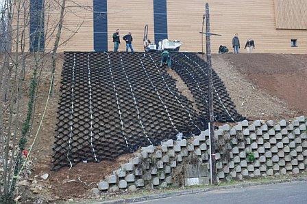 Géoalvéolaire en géotextile non tissé thermolié dont les bandes sont cousues et collées. Idéal pour le confinement de couches de terres ou de matériaux granulaires. Ces géoalvéoles sont parfois recouvertes de géotextiles ou bionattes biodégradables ou encore avec un géomat permanent (géogrille tridimensionnelle remplie de fibres). C’est l’outil idéal pour le maintien de terre sur talus ou berges fortement inclinés et la réalisation de merlons. |