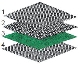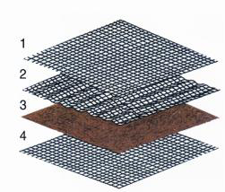 Paillage de fibres végétales avec films microperforés opaques en sous face, posés en quinconce de manière à être complètement étanches à la lumière tout en laissant circuler l'air et l'eau et empêchant la germination des mauvaises herbes. Couche supérieure composée de 100 % de fibre de coco ou mélangée avec des végétaux marins ininflammables, cousue à un premier filet.