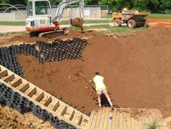Les systèmes géoalvéolaires visent au renforcement et à la stabilisation des sols par la mise en oeuvre d’une structure alvéolaire (nid d’abeille à remplir de terre, graviers ou pierres). Ces panneaux d’alvéoles sont composés d’un ensemble de bandes (en géotextile non tissé thermolié ou en polyéthylène haute densité (PEHD perforé) qui forment des cellules hexagonales ou romboïdes. Les nappes de cellules sont déployées, fixées au sol puis ensuite remplies de matériaux terreux ou pierreux. Les géocellules sont livrées pliées et s’étirent sur chantier comme un accordéon. Une fois déployées et fixées, les cellules hexagonales ou romboides de différentes tailles et profondeurs peuvent être remplies avec de la terre, du sable ou des gravillons.