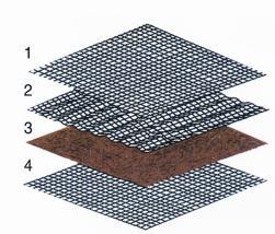 Livrés en rouleaux de 2 m de large pour 17 m de long. Structure tridimensionnelle constituée de 3 grilles synthétiques dont une ondulée, le tout lié mécaniquement pour former un matelas de 17 mm avec un remplissage de 270 g/m² de fibres de coco. La tension tangentielle admissible, sans végétation, est d’au moins 153 N/m² pour une durée de crue de 0,5 heures et ≥ 144 N/m² pour 50 heures (vitesse de 3,2 m/s pour tapis non végétalisé et 6 m/s une fois végétalisé).