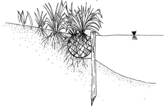 La fixation se fait à l’aide d’une rangée ou de 2 rangées de pieux en quinconce. Les pieux d’au moins 1.50 m ou de longueur suffisante doivent garantir un ancrage permanent. Nous conseillons des pieux inertes (bois sec) de 8/10 cm de diamètre avec un espacement de 0.80 m. La continuité des boudins coco végétalisés est réalisée par mise en pression des boudins les uns à la suite des autres (bout à bout) et avec fixation entre eux à l’aide d’une cordelette de coco ou de nylon. (voir figure ci-contre). Cela garanti une protection continue contre l’érosion.