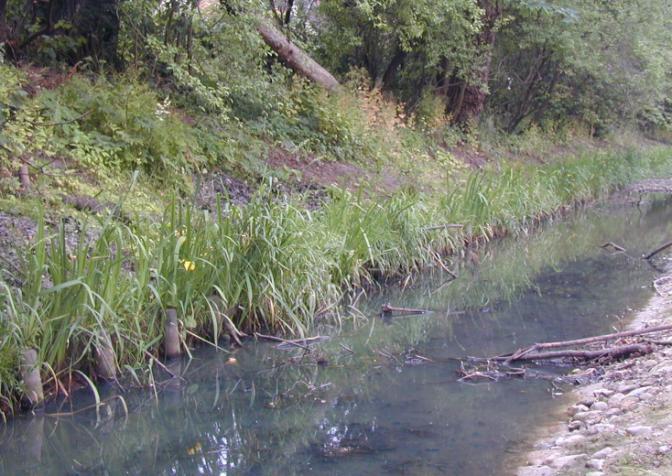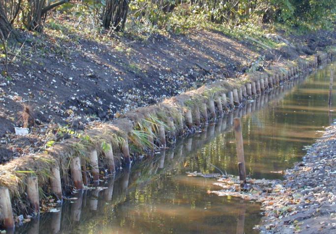 La stabilisation de la berge commence au pied du talus. Dans le cas de profondeurs trop importantes il est nécessaire de travailler avec plusieurs boudins superposés ou de disposer en pied un enrochement ou un gabion sac rempli de pierres.