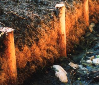 Ensuite, ils sont fixés par des pieux. Il suffit de mettre une rangée de pieux coté rivière et coté berge ; la pression du sol stabilise le boudin. Habituellement, on utilise des pieux d'environ 1 à 1.50 m de longueur. L’intervalle entre les pieux varie de 0.75 à 1m.