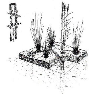 Les géonattes végétalisées d’hélophytes sont fixées avec des petits piquets (ou clous) de bois (30 à 50 cm) munis en partie supérieure d’encoches, ou percés en tête et munis de tourillons. Ces clous sont enfoncés dans le terrain en traversant les géonattes et une cordelette du filet est coincé dans l’encoche ou sous le tourillon.