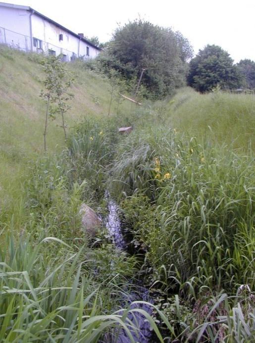 La photo de gauche montre la mise en place en Février/Mars. Les hélophytes ont des rhizomes, des racines et des drageons. La bio-masse aérienne est morte. La photo de droite montre le développement du même site en juin, la même année.
