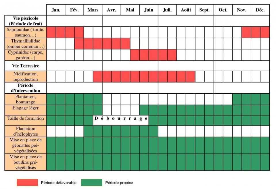 La période la plus appropriée pour intervenir en aménagement de berges par des techniques de génie végétal traditionnelles (c'est-à-dire d’ouvrages à base de saule) se situe entre octobre et mars lorsque le matériel végétal est au repos végétatif. A ce moment de l’année, l’ensemble de l’écosystème végétal et terrestre tourne au ralenti ce qui permet d’avoir un impact moindre sur le milieu. Toutefois, durant cette période, les traversées de rivière sont à proscrire en raison de la présence de frayère à truite dans le lit du cours d’eau.