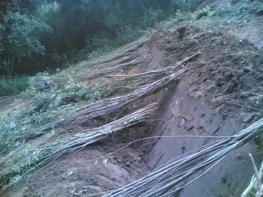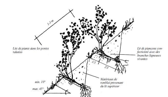 On utilise des branches d’espèces ligneuses et leur ramilles, aptes à rejeter (le saule étant prédominant). Mise en oeuvre : Les branches doivent être disposées à raison de 10 à 20 pièces par mètre. La pose des branches se détermine d’après la nature des sols.