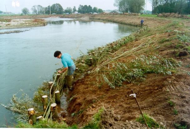 Utilisation de branches de saule inertes ou vivantes derrière des pieux afin de lutter contre l’érosion du pied de berge.