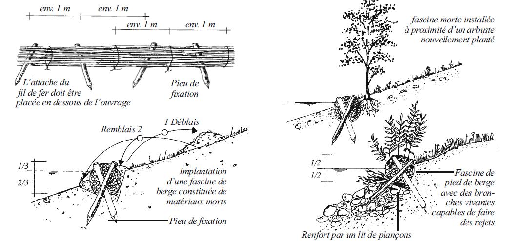 Suivant les sols, les fascines seront fixées tous les mètres, avec des pieux de saule ou de châtaignier.