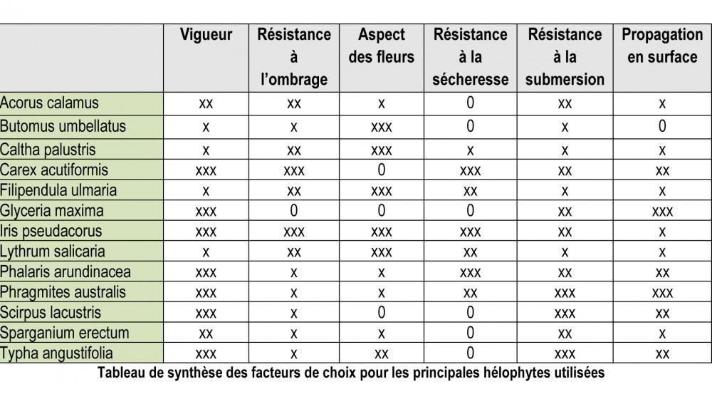 Les plantes hélophytes sont utilisées en fonction de leur adéquation avec le milieu et de leur possibilité de développement au sein de ce milieu. En dehors du choix d’espèces lié à l’aspect et aux caractéristiques morphologiques propres à la plante (aspect des fleurs et/ou du feuillages, taille à maturité, …), d’autres facteurs sont importants à prendre en compte pour le choix des espèces à utiliser :