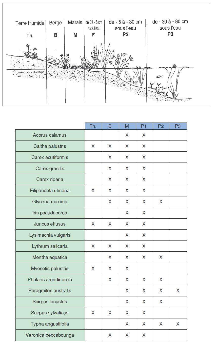 (Voir ci-dessous tableaux de répartition sur la berge des différentes espèces d’hélophytes)