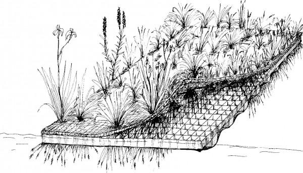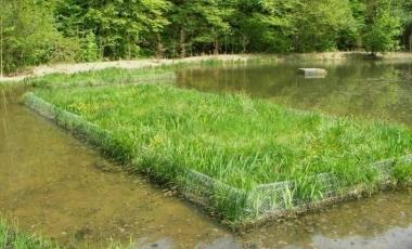 Structures flottantes modulaires, articulées en polyéthylène semi-rigides recouvertes d’une natte coco plantée d’hélophytes.