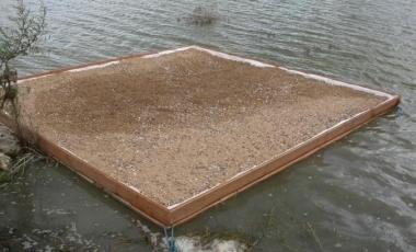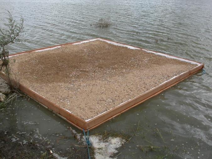 Structures flottantes modulaires, articulées (système d’attache tenon-mortaise breveté), en polyéthylène basse densité recyclé (et recyclable), semi-rigides (résistantes au gel, imputrescibles et neutres pour l’environnement), pour être recouverte de sable ou graviers.