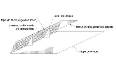 Procédé de remblais armés associant un parement végétalisable incliné d’environ 65 à 70° à des nappes de renforts horizontales (géogrilles, géotextiles, grilles métalliques) qui apportent l’ancrage du parement et le renforcement du massif. Le parement comporte un rétenteur de fines en association avec un tapis de lutte contre l’érosion. Utilisés pour le raidissement de talus et les soutènements de grande hauteur en remblais, cette solution supporte des tassements différentiels.