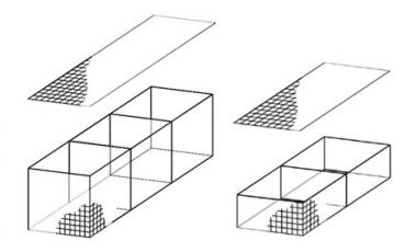 Cages obtenues par assemblage de panneaux électrosoudés en mailles carrées ou rectangulaires et en fils de 4.5 ou 5 mm revêtus de Galfan® (alliage de zinc et aluminium, 5 à 6 fois plus résistant que la galvanisation), revêtu de PVC ou inox. L’assemblage in-situ évite le doublage inutile des cotés et des couvercles par les fonds du rang suivant